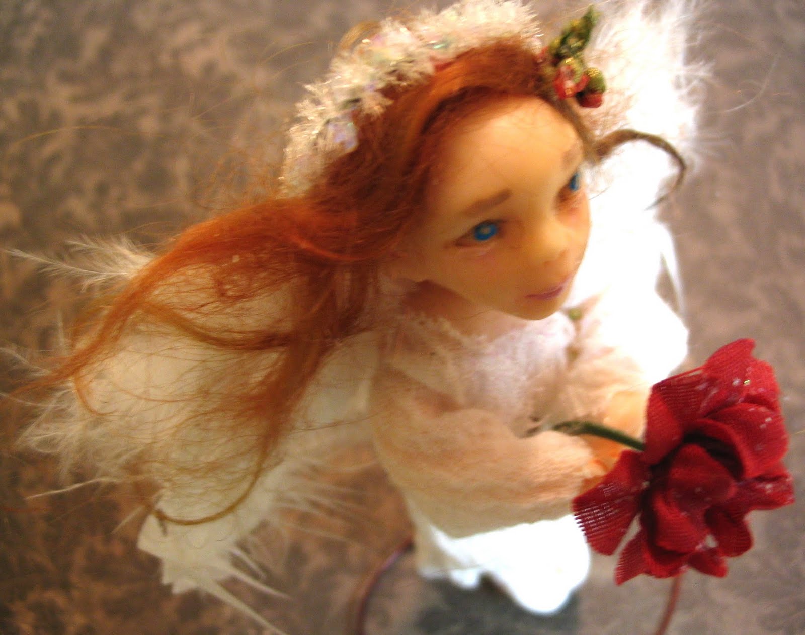 With a sweet little angel. Wings are always a challenge, but I think these turned out pretty well. I used a white fabric base, wing shaped, and glued on feathers. If I was making a large doll I would have to fuss with detail a little more. But the feathers cover a large area when you make tiny wings, and they suit her.